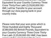 NOTE: YOUR WINNING AMOUNT OF Three Hundred and Eighty Thousand (£380,000.00) British Pounds, Equivalent to your Country Currency Three Crore Thirty-Five Lakh (3, 35,00,000.00/-INR.) IS INSURED WITH THE RBI BANK....