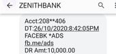 A fraudulent transactions was done in my account without my authorization. On 26th October 2020 at 8:42pm i noticed a debit alert in my account for facebook ads which I did not authorized.