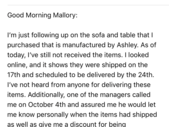 I would give zero stars if I could. I ordered a sofa and sofa table manufactured by Ashley on September 11. The items said in stock. A week later, I contacted AAFES via chat to confirm the shipping time-frame. I was told the items would be shipped on October 1st. Meanwhile, I gave my sofa away...