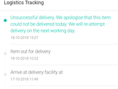 Sepatutnya khamis 18/10/18 cek tracking dah out for delivery (ER 570456056MY) tunggu sampai petang dan cek katanya batal tak dapat nak hantar nak arrange keesokan hari tapi hari ni masih tak hantar. Tolong ambil tindakan......