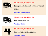 Mohon pihak pos laju chek barang saya dah sampai mana.last update barang out darinbutterworth tapi tiada update y diterima lepas itu dah smapai mana.come on la,pos laju ape ni kalau dah seminggu belum dpt barang lg...