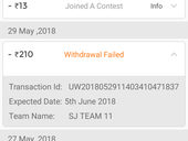 I requested withdraw of rs 210 amount from dream11 account to my verified bank account on 29-may-18, in response e-mail received saying that amount will be submitted till 5-june-18 , today i checked my account no amount was received and it shows that transaction...