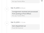 barang blm smpai dari 14 feb hingga hri ini dan status brang masih lagi di poslaju transit office.brang itu sya prlukan scpat mngkin dalam bulan ini dan sya mmnta tolong ats tnggungjawab dlm msalah ini