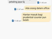 When delivery tat time, the guy did call me once, but i nt free as i in meeting, so he drop me message. I did replied the message mentioned that he can put the parcel to my front desk officer, as that is an Prudential branch, front desk open from 9am...