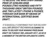 Whats up company uk 2016 winner ...im alwin raju v sir uk percel nd gift dispeches manger mr.bright rechmand sir u hav to comeing rbi for dehili ...sir im submit 9/- thousand rupees bt u have dont any my percel nd gift soooo plzzzz give my percel nd gift soooooo please transfer my winning...