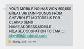 I have received a sms from +8801995938781 at 10:21 am, 17 January 2017 that contains "YOUR MOBILE NO HAS WON 500,000 GREAT BRITAIN POUNDS FROM CHEVROLET MOTORS UK FOR CLAIMS SEND NAME,ADDRESS,MOBILE NO,AGE,OCCUPATION TO EMAIL: [email protected]"