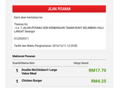 I had placed an online orders thru Mcdonald online delivery apps at 11:05am on 11/12/2016, and I had received confirmation orders and was accepted thru email. At around 12:55 noon, I received 5 calls from McDonald's Bandar Tun Hussein Onn, saying that they will not deliver because is out...