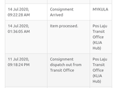 KIRIM BARANG 8JULY. UPDATED TERKINI 14JULY "EN ROUTE TO AUSTRALIA". SAMPAI SEKARANG BELUM ADA APA2 UPDATE TERKINI DAN BARANG SAYA BELUM SAMPAI KE PENERIMA. SELALU GUNA POSLAJU OK JE. MASA PKP SAYA KIRIM KE AUSTRALIA TEMPAT YANG SAMA AMBIL MASA 15 HARI JE. SKRG DAH NORMAL BALIK, ...