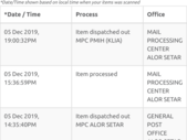 I went to Malaysia post tracking and checked from 05/12/19 until 11/12/19 and it always only shows latest update as at 05/12/19 19:00:32 PM that item dispatched out MPC PMIH (KLIA) Mail processing...