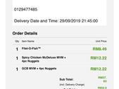 saya order delivery tapi ada item missing, saya order pukul 9:14pm terima makanan 10:13pm walaupun dijanjikan pada 9:45pm akan sampai ... bila call balik 3 kali 10:20pm outlet mcd cheras leisure mall tidak ada yang angkat.. saya tak dapat utk makanan GCB mvm ... dgn no order 49-29/09/2019-266678.....