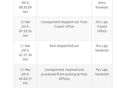 saya order barang dari 21/03 sampai sekarang tak sampai2. check tracking number, masih di tempat yg sama.. bila nak sampai ni.. takkanlah sampai skrg 29/03 posmen x nampak barang tu. sampai brpa lama tunggu
